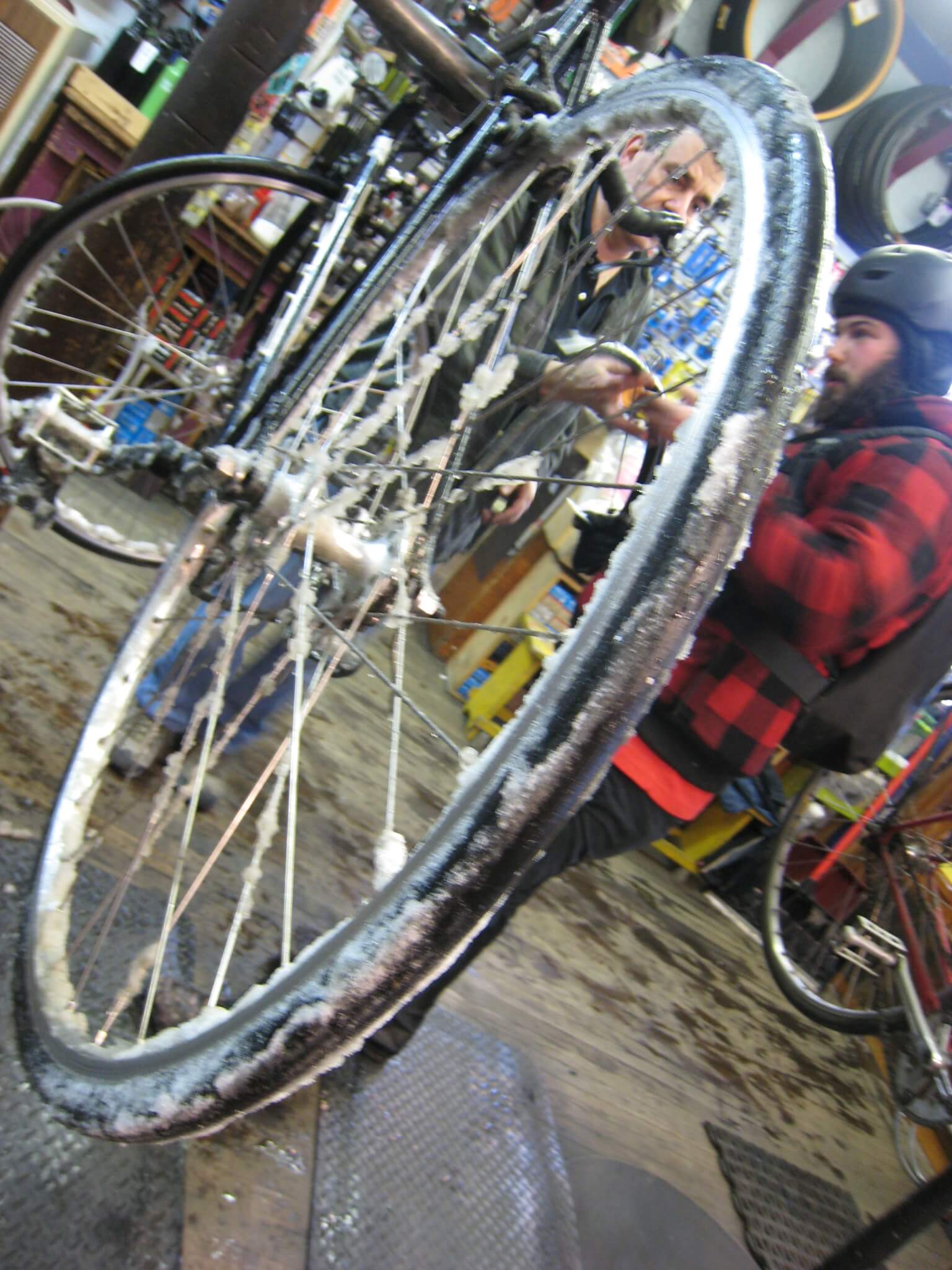 We thought we’d be slow today because of the weather – but what a pleasant surprise when our shop is filled with folks taking the opportunity to work on their own bikes . Snow day, play day. Lots of fender installs, snow tires and general tlc insuring safe riding for the remaining winter.