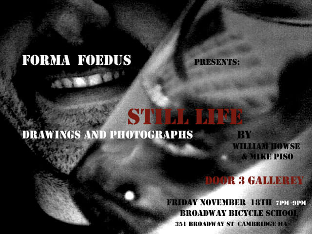 Door 3 Gallery proudly presents the collaborative effort of Mike Piso and William Howse as Forma Foedus, showing drawings and photographs of “still” life.