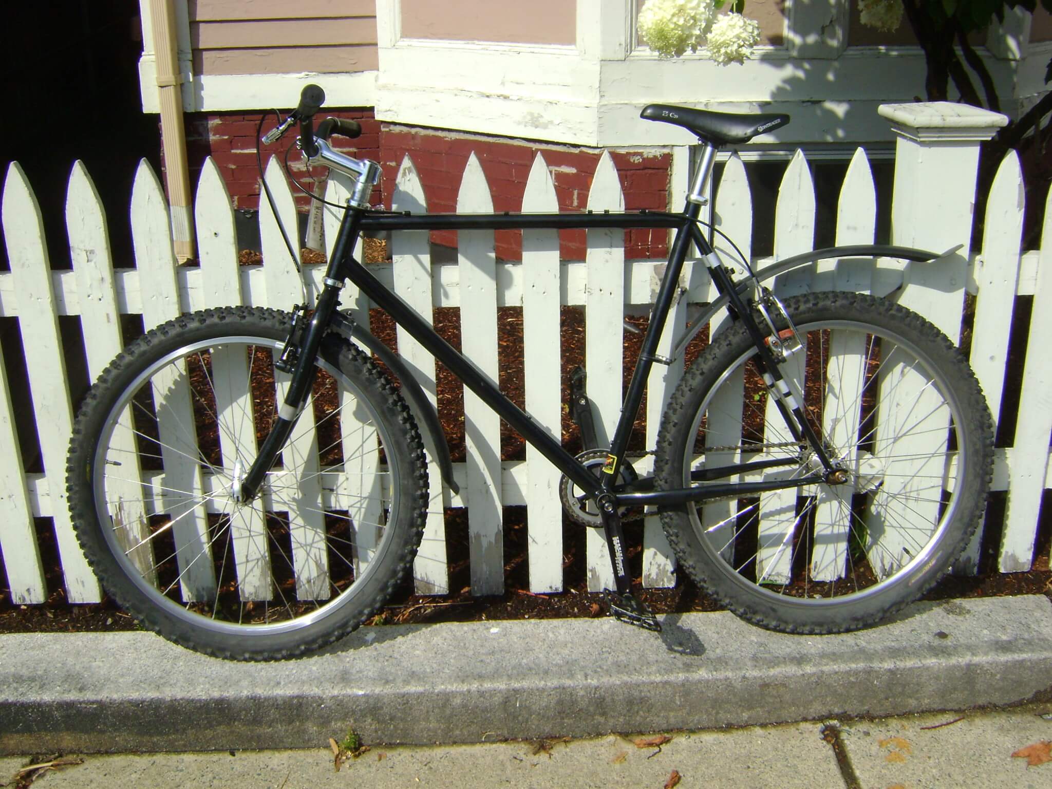 22 inch frame for a larger rider, super nice handbuilt wheelset with paul hubs on mavic rims – with clip on fenders to keep the mud down.