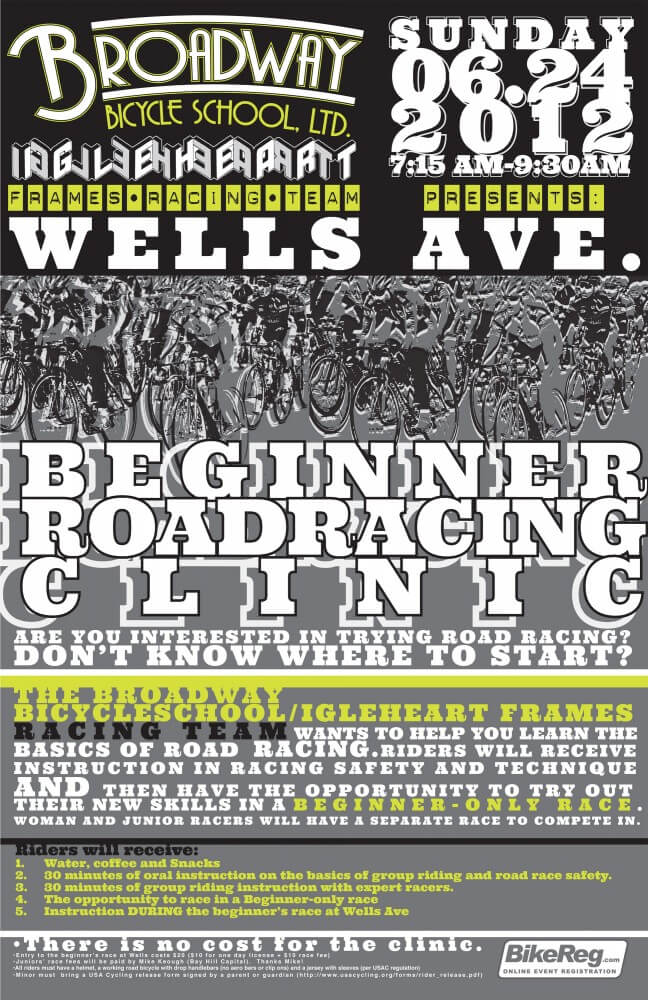 Are you interested in trying road racing? Don’t know where to start? The Broadway Bicycle School/Igleheart Frames Racing Team wants to help you learn the basics of road racing. Riders will receive instruction in racing safety and technique and then have the opportunity to try out their new skills in a beginner-only race. Woman and junior racers will have a separate race to compete in.